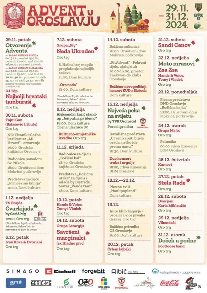 Advent će biti otvoren sve dane u tjednu, no programi i nastupi održavat će se petkom, subotom i nedjeljom, pa će tako 6.12. nastupiti duo Dvorjani i Ivan Kova, 7.12. Neda Ukraden te 8.12. stand up Aleksandra Lazića uz kulturno – umjetnički program na trgu. U petak, 13. 12. svirat će Tomi i Vladek, u subotu, 14. 12. Savršeni marginalci, a u nedjelju, 15. 12. pripremat će se najveća peka na svijetu, pored NK Oroslavje. – Peka će biti promjera tri metra i teška preko tonu, a izradit će ju Orometal. Peći ćemo oko 150 kilograma teletine i još toliko povrća, a kasnije to podijeliti posjetiteljima – najavljuje Šimunić. Do kraja prosinca bit će tu i priredba Osnovne škole Oroslavje, Ples na svili, Črleni lajbeki, Sandi Cenov, Moto Mrazovi i Zsa Zsa. Svirka će biti i na Badnjak, prije i poslije polnoćke, kao i na Štefanje kada će svirati Kumovi. U petak, 27. 12. nastupit će Stela Rade, u subotu, 28. 12. Dvorjani i Karla Miklaužić, a Advent u Oroslavju završava Dočekom u podne uz Footloose band. Kao i lani, i ove godine velika atrakcija bit će klizalište, koje će do 19. 12. raditi od ponedjeljka do četvrtka od 15 do 22 sata, petak i subotom od 15 do 00 sati, a u nedjelju od 10 do 00 sati. Klizalište će od 20. 12. do 31. 12. biti otvoreno od 10 do 00 sati svaki dan (osim 31.12. do 18 sati), a neće raditi 25. 12. – Bit će tu i bogata gastro ponuda, kao i razni izlagači.