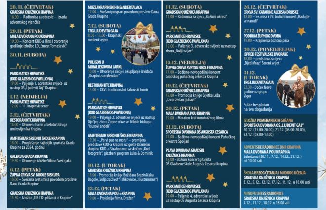 Program Adventa u Gupčevom kraju započinje 1. prosinca, kićenjem bora kod Kapelice sv. Križa u Hižakovcu u 15 sati, u organizaciji Odbora za očuvanje baštine Gupčevog kraja Hižakovec. Zatim je 3. prosinca na redu izrada božićnih ukrasa od krep papira u DV Jurek u 16.30 sati, u organizaciji DV Jurek i Udruge seljaka Općine Gornja Stubica, a istoga dana u Knjižnici u Donjoj Stubici bit će putopisno predavanje Božene Galoić 'Aljaska – ledeno kraljevstvo' u 18 sati. U KTIC – u u Donjoj Stubici 7. prosinca otvorit će se izložba 'U susret Božiću' Ankice Petrović u 18 sati, u organizaciji Gornjostubičke udruge Lipin cviet, Stub kluba i TZ područja Gupčev kraj. Knjižnica Donja Stubica održat će 9. prosinca od 17 do 18 sati još jednu pričaonicu s Magdalenom Blagec za djecu od 5 do 8 godina, a u srijedu 11. prosinca u knjižnici slijedi radionica 'Mali znanstvenici – sijanje pšenice' od 17 do 18 sati, za djecu od 5 do 10 godina. U DV Jurek 12. prosinca u 17 sati održat će se tradicijski prikaz kićenja bora 'Kak je negda bile' u organizaciji vrtića i Udruge seljaka OGS. Djeca iz vrtića i osnovne škole zajednički će kititi bor i Spomen parku Rudolfa Perešina 13. prosinca u 10 sati, u organizaciji Općine Gornja Stubica i UBDR Sveti Juraj. Tradicionalna Božićna bajka u Gupčevom kraju održat će se u Sportskoj dvorani u Donjoj Stubici 14. prosinca od 11 sati, u organizaciji TZ područja Gupčev kraj, a istoga dana u 17 sati u KTIC – u se održava Božićna edukativna radionica 'Božićni stubički luster' s Irenom Miholić, u organizaciji KUD - a Stubica i Stub kluba. U Župnoj crkvi sv. Jurja u Gornjoj Stubici 15. prosinca u 18 sati održat će se koncert u sklopu 30. Festivala Orgulje Heferer u organizaciji Kajkaviane, a 18. prosinca u crkvi s početkom u 18 sati slijedi koncert Osnovne glazbene škole pri OŠ Matija Gubec, u organizaciji OŠ Matija Gubec. Osnovna škola imat će i svoj adventski sajam 16. prosinca od 18 do 19.30 sati s prigodnom prodajom ručnih radova učenika, a 20. prosinca u KTIC – u se otvara izložba 'Anđeli' Jadranke Blagec, u organizaciji TZP Gupčev kraj. Istoga se dana, 20. prosinca, u Galeriji Pod lipom u 19 sati otvara Božićna izložba likovne radionice 'Lipa' te promocija zbirke poezije Gordane Pavlinić, u organizaciji KUD – a Matija Gubec. Tradicionalni božićni koncert Vitomira Ivanjeka održat će se u Fellerovoj zgradi 22. prosinca u 19 sati u organizaciji TZP Gupčev kraj i Kajkaviane, a iste se večeri, u 18 sati u crkvi u Gornjoj Stubici održava adventski koncert Puhačkog orkestra VZO Gornja Stubica. Ženski vokalni sastav KUD – a Stubica i Puhački orkestar DVD – a Donja Stubica tradicionalni božićni koncert održat će u crkvi u Donjoj Stubici 27. prosinca u 18 sati, a program Adventa u Gupčevom kraju završava Božićnim koncertom 'Svim ljudima dobre volje' u Sportskoj dvorani OŠ Matija Gubec u Gornjoj Stubici, 28. prosinca u 18 sati, u organizaciji KUD – a Matija Gubec.