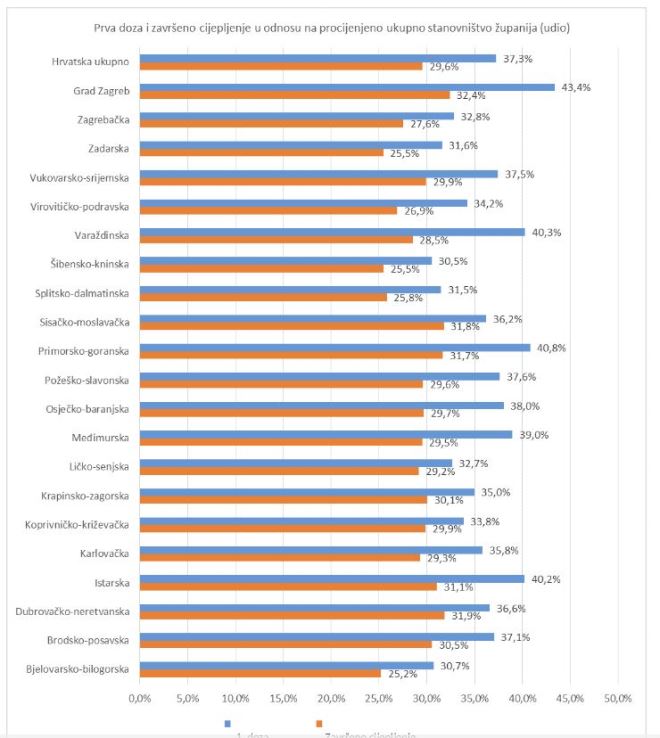 Najveći obuhvat cijepljenih prvom dozom postignut je u Gradu Zagrebu (43,4% ukupnog stanovništva, odnosno 52,7% odraslog stanovništva). Završeno cijepljenje ukupnog stanovništva u najvećem je obuhvatu ostvareno u Dubrovačko-neretvanskoj županiji (31,9%), dok je završeno cijepljenje odraslog stanovništva u najvećoj mjeri ostvareno u Gradu Zagrebu (39,4%).