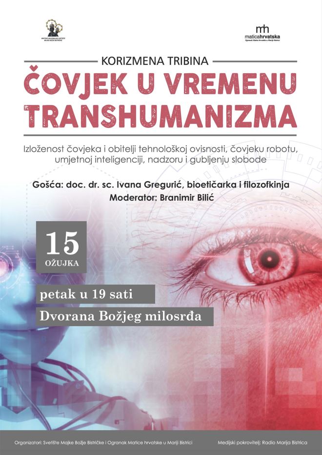 Ogranak Matice hrvatske u Mariji Bistrici i Svetište MBB-e i ove godine organiziraju korizmene tribine. Prva od dvije tribine, održana je 1. ožujka i imala je veliki odaziv. Druga tribina na rasporedu je u petak 15. ožujka, u 19 sati u Dvorani Božjeg milosrđa. Tema je ''Čovjek u vremenu transhumanizma (izloženost čovjeka i obitelji tehnološkoj ovisnosti, čovjeku robotu, umjetnoj inteligenciji, nadzoru i gubljenju slobode)''. Gošća je doc. dr. sc. Ivana Gregurić, bioetičarka i filozofkinja, a moderator Branimir Bilić, inače idejni začetnik ovih tribina.