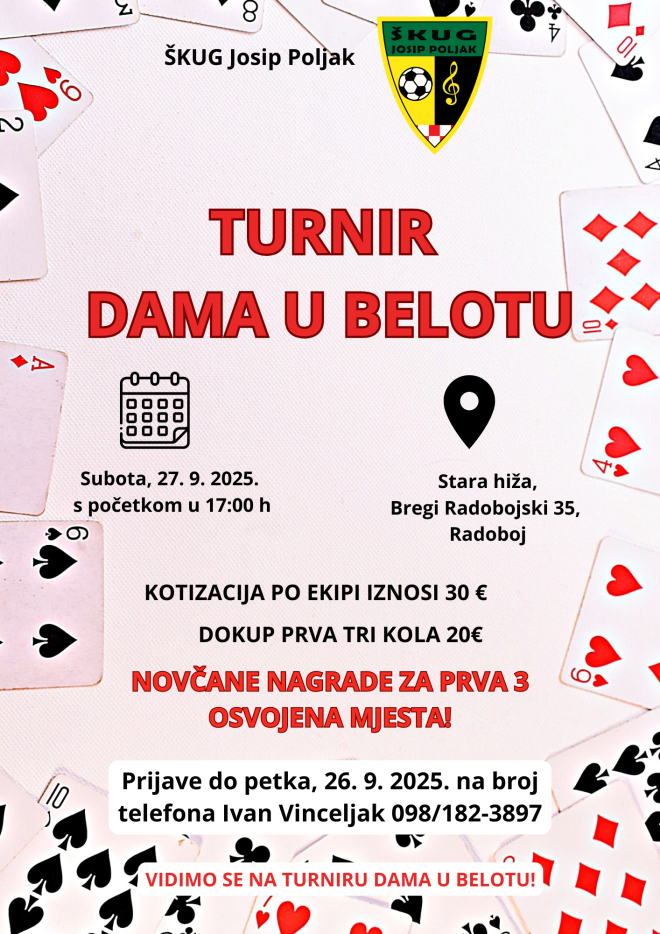 Športsko kulturna udruga građana Josip Poljak organizira u subotu 27. rujna 2025. turnir dama u belotu s početkom u 17:00 sati. Turnir dama održati će se u „Staroj hiži“ u Bregima Radobojskim, na adresi Bregi Radobojski 35, a prijave se ostvaruju na broj telefona: 098/182-3897 (Ivan Vinceljak) do petka, 26. rujna.