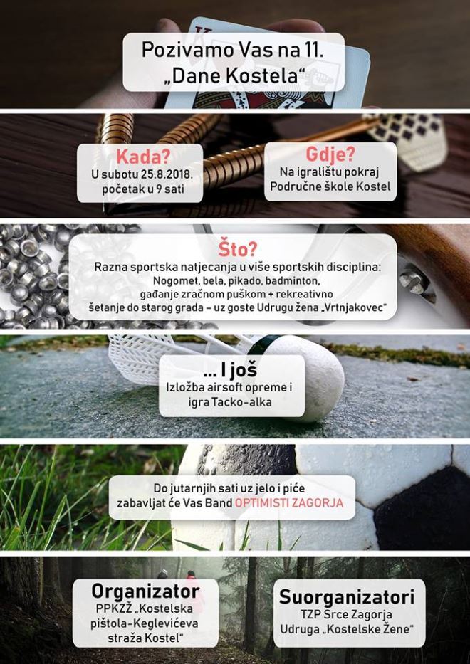 Događanja će započeti u 9 sati na igralištu kod Područne škole Kostel, a ove će se godine otvorenje po prvi puta održati uz izvođenje glasnog pucnja. Tijekom cijelog dana očekuju vas razna sportska natjecanja u više disciplina, kao što su malonogometni turnir, turnir u beli, pikado te gađanje zračnom puškom. Prijave za sudjelovanje vršit će se na dan događanja. U sklopu programa moći će se pogledati izložba airsoft opreme u organizaciji ASK Kune, a u popodnevnim satima održat će se tačko-alka u organizaciji Udruge kostelskih žena. Također, organizirana je i rekreativna šetnja do Starog grada, uz Udrugu žena Vrtnjakovec, koja je proteklih nekoliko godina rado viđen gost u Kostelu.