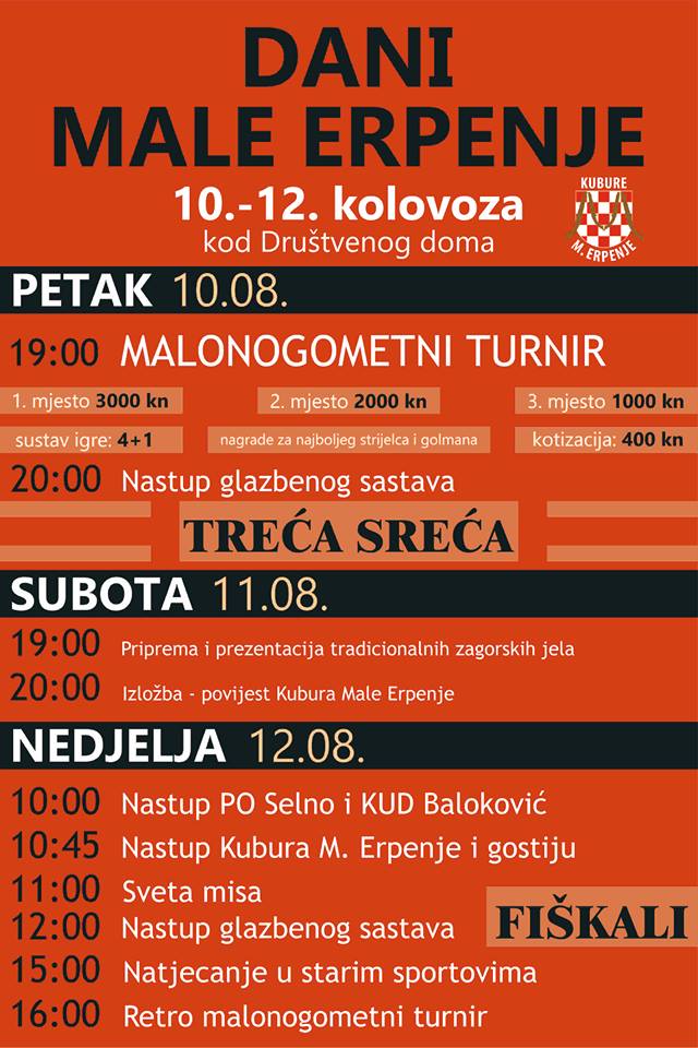 Ovog vikenda, od petka 10. kolovoza do nedjelje 12. kolovoza održat će se tradicionalni Dani Male Erpenje. U petak s početkom u 19 sati je na programu malonogometni turnir. Sustav igre je 4+1. Nagrada za prvo mjesto je 3000 kuna, za drugo 2000 kuna, a za treće mjesto 1000 kuna. Kotizacija iznosi 400 kuna, a tu su i nagrade za najboljeg strijelca i golmana. Isti dan, u 20 sati tu je i nastup glazbenog sastava Treća sreća.