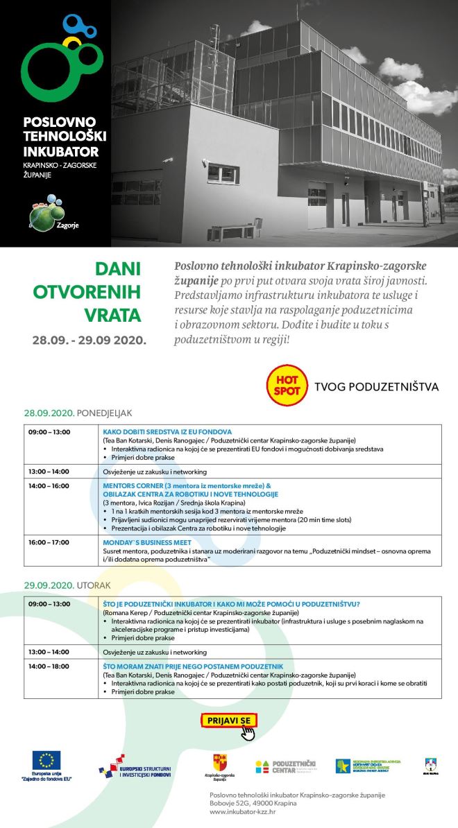 Poslovno tehnološki inkubator Krapinsko-zagorske županije po prvi put otvara svoja vrata široj javnosti. Dani otvorenih vrata će se održati od 28. - 29.09. 2020.