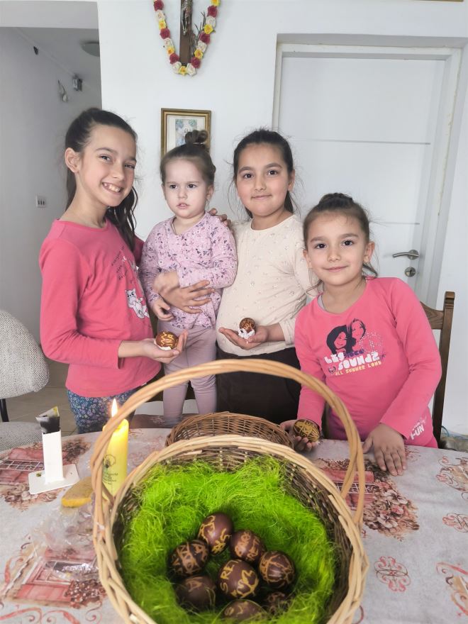 Osmero prekrasnih djevojčica na koje ova baka može prenijeti svoja znanja i koje budu, kad odrastu, već prave majstorice u pripremi kolača! Svake godine s bakom bojaju pisanice, ukrašavajući ih na starinski način. Sirova jaja prvo su ukrasile voskom, a onda ih skuhale u lukovini. Vrlo su vješte djevojčice u tome, pa su nam s ponosom pokazale pisanice koje su ove godine napravile, po tradiciji koju će zasigurno čuvati za budućnost.