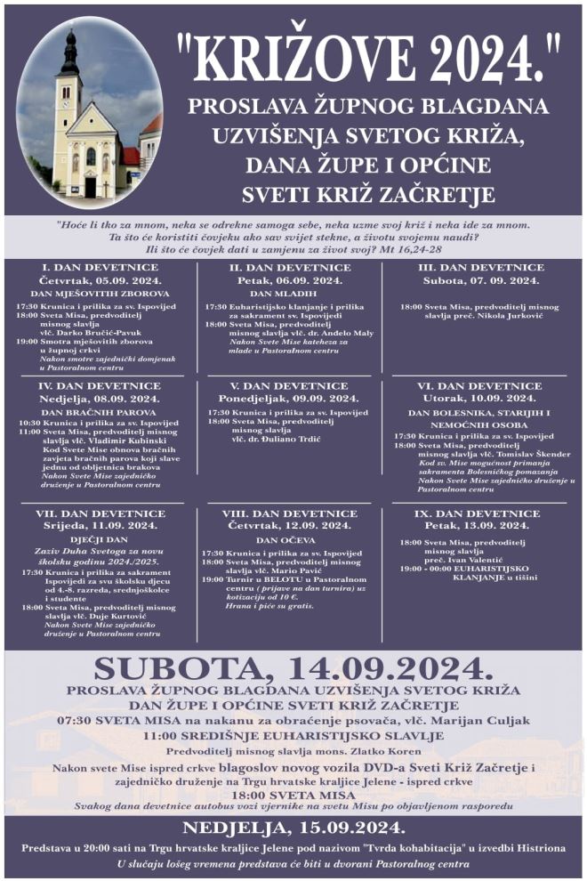 Upravielj župe Uzvišenja Svetoga Križa u Svetom Križu Začretju i dekan Krapinskog dekanata, preč. Vladimir Drnetić, najavio je devetnicu i prigodni program kojim se ova zagorska župa priprema za proslavu svoga Dana, blagdana Uzvišenja Svetog Križa, kojeg katolici slave 14. rujna.