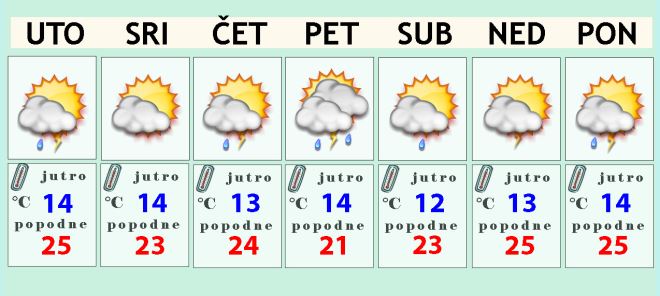 Ponedjeljak izgleda djelomično sunčan, ali i daje postoji mogućnost za kišu ili pljusak s grmljavinom. Temperatura zraka u laganom porastu na 25 Celzijevih stupnjeva.