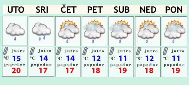 Za srijedu izgleda jesensko vrijeme. Oblačno i još svježije, a povremeno će biti kiše uz sjeverni vjetar pa će sredina tjedna u cijeloj zemlji donijeti promjenu vremena. Jutarnja temperatura oko 14-15, a dnevna samo malo viša, između 14 i 17 Celzijevih stupnjeva.