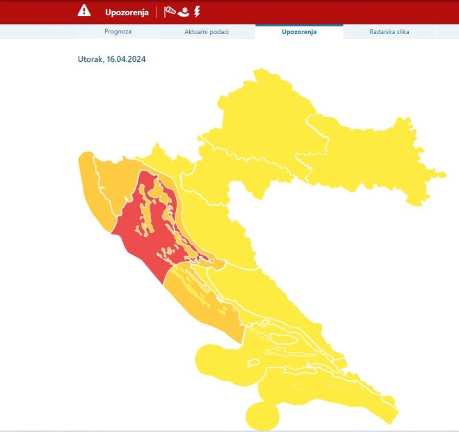 No, za dvije regije DHMZ je izdao crveno upozorenje, što znači 'izuzetno opasno vrijeme', koje je se tako može očekivati na Kvarneru i Kvarneriću te u Velebitskom kanalu.