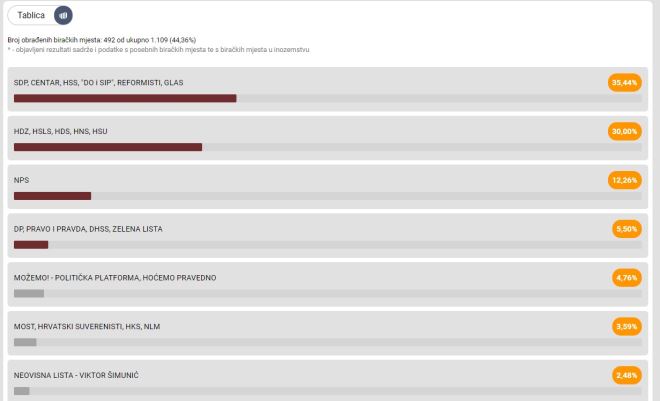 No za sada SDP ima 35,44%, HDZ okruglih 30,00%, Nezavisna platforma Sjever 12,26%, a Domovinski pokret 5,50%.