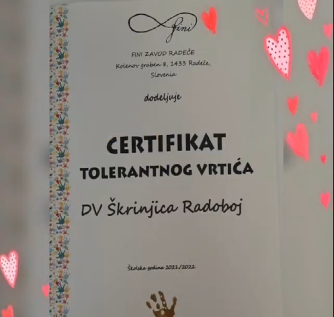 Dječji vrtić Škrinjica Radoboj primio certifikat tolerantnog vrtića