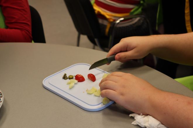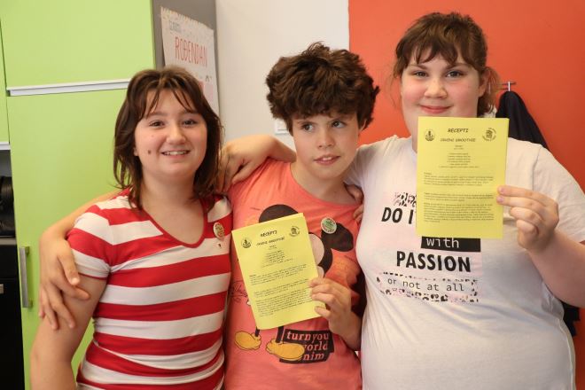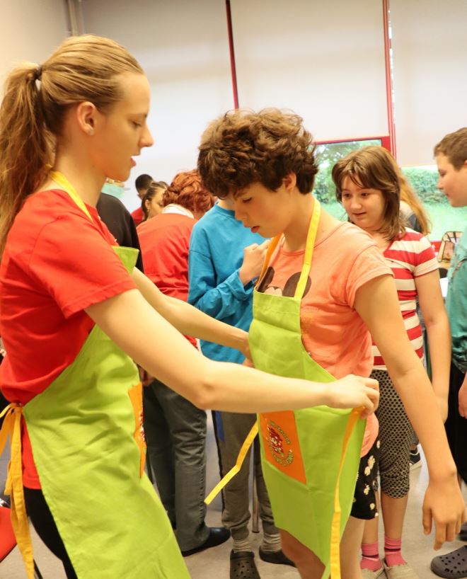 Veliko zanimanje izazvala je mala radionica zdravoga kuhanja koju je vodila profesorica Anka Ilinčić i asistent u radionicama zdravoga kuhanja Vjekoslav Flegar uz pomoć volonterke Melite Hršak i dječjih vijećnica i forumašica DND-a Helene Ban i Sare Premerl Peštaj. Djeca su zajedno s DND-ovskom ekipom i uz veliku podršku učiteljica i pomoćnica u nastavi Centra za odgoj i obrazovanje Krapinske Toplice pripremali zdravi domjenak. Prvo se miksao Crveni smoothie od jagoda, banana i jabuka, a klinci su sudjelovali u pripremi voća za miksanje. Zatim se radio Humus – zdravi namaz od slanutka, a djeca su sjeckala papriku, cherry rajčice, krastavce i masline te radili zdrave sendviče na kukuruznom kruhu i dekorirali povrćem prema želji.
