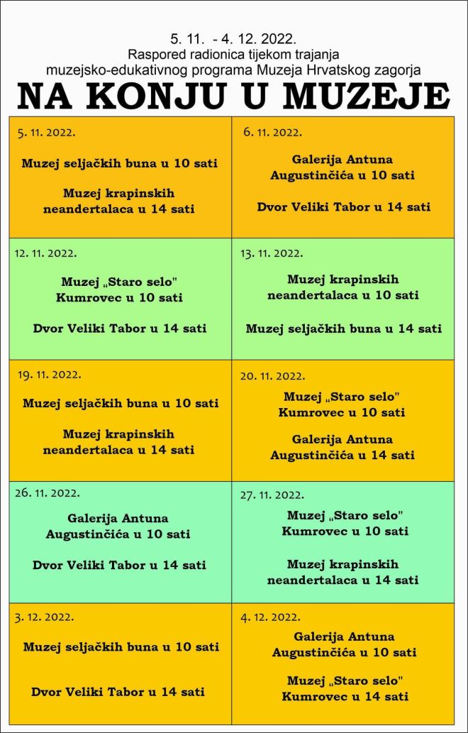 U protekla tri vikenda, u 5 muzeja sastavnica Muzeja Hrvatskog zagorja, različite radionice, ali s istom osnovnom temom KONJA, pohodilo je četrdesetak djece. Svi oni kandidati su za glavnu nagradu! Prema rasporedu održavanja interaktivnih radionica u jednome se danu može stići na dvije lokacije jer jutarnje druženje s drvenim konjićima počinje u deset, a poslijepodnevno u 14 sati.