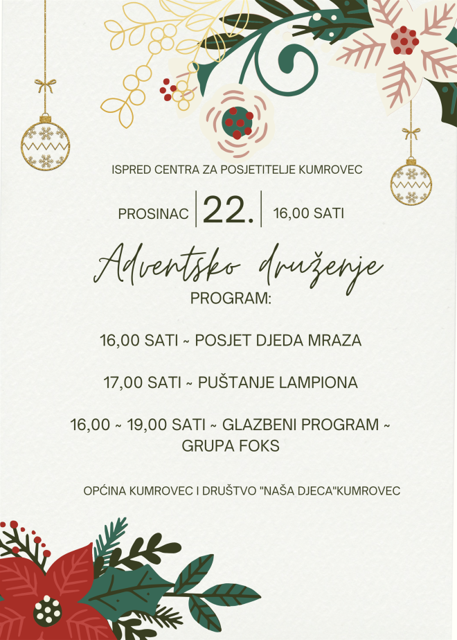 Od 16,00 sati očekuje vas Djed Mraz u organizaciji Društva "Naša djeca" Kumrovec i puštanje lampiona od 17,00 sati.