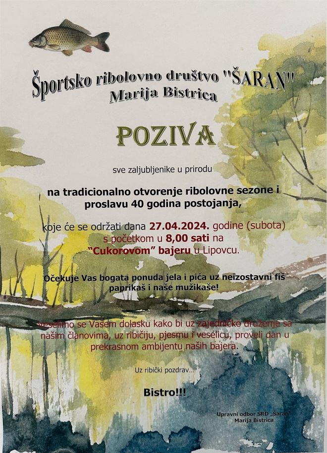 Športsko ribolovno društvo ''Šaran'' Marija Bistrica poziva sve zaljubljenike u prirodu na tradicionalno otvorenje ribolovne sezone, ali i proslavu 40 godina postojanja društva, koje će se održati u subotu 27. travnja, s početkom od 8 sati na ''Cukorovom bajeru'' u Lipovcu.