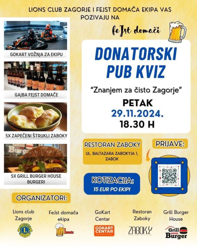 Donatorski pub kviz u organizaciji LC ZAGORJE i feJst domače ekipe održati će se u petak 29.11.24. godine u Restoranu Zaboky u Zaboku.