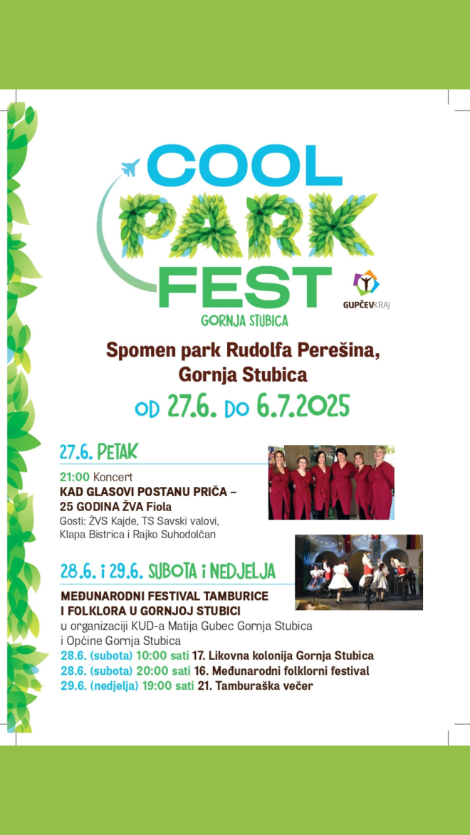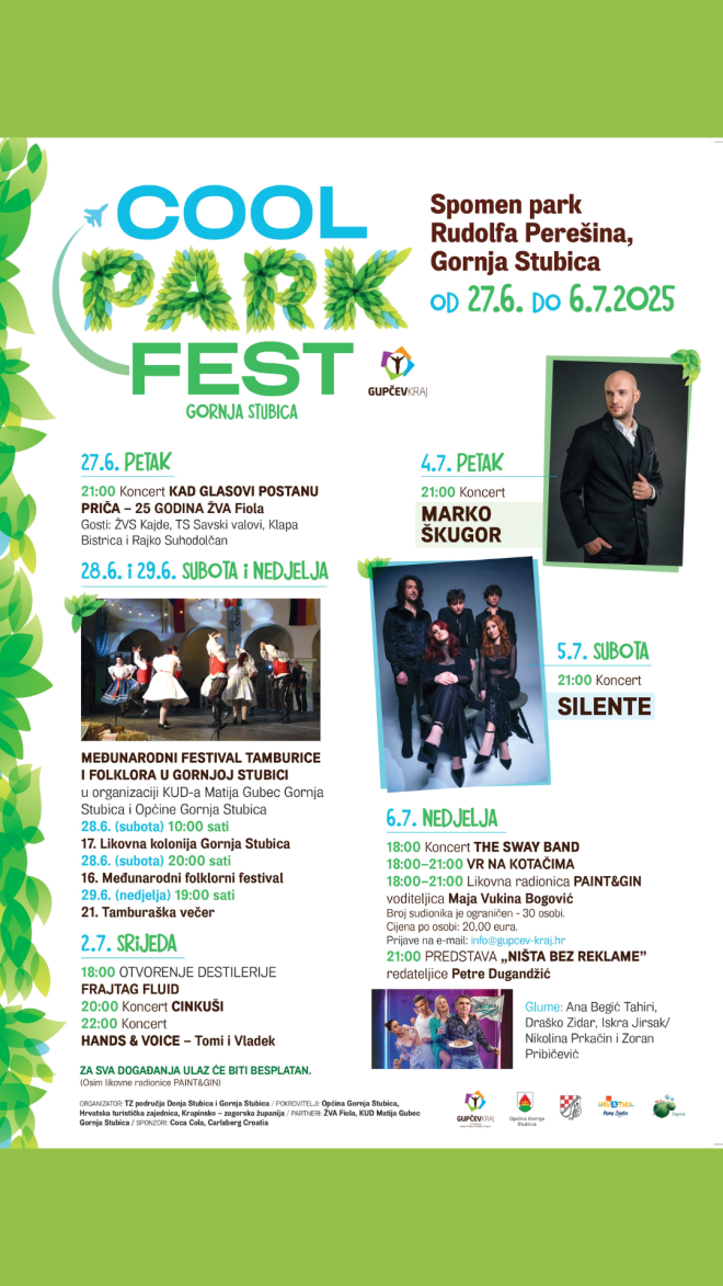 COOLturno ljeto u Gupčevom kraju se nastavlja! Nakon Stubica festa, manifestacije koja je u 3 dana okupila više od 20.000 posjetitelja, kreće novi kulturno zabavni doživljaj u Spomen parku Rudolfa Perešina u Gornjoj Stubici – COOL PARK FEST. Zbog radova i sanacije dvorca Oršić, festival Ljeto u dvorcu Oršić ide na kratku jednogodišnju pauzu. S toga, je TZ područja Gupčevog kraja, osmislila novi kulturni događaj, koji će se održati u neposrednoj blizini, a to je centar Gornje Stubice, tj. na lokaciji kod Spomen park Rudolfa Perešina. Park će postati idealno mjesto za druženje u Gupčevom zelenilu. To će biti guštanje u hrani i piću, koncertima, predstavi i dobroj zabavi.
