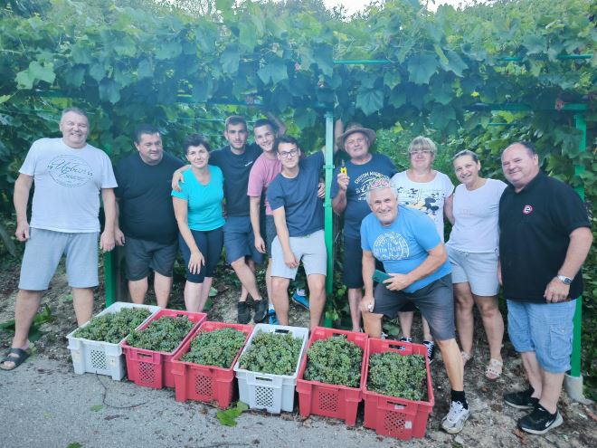 Berbu je jučer odradila obitelj Poštek, a pridružili su im se prijatelji. Kako se i šika, juškalo se na zadnjem pobranom trsju, a onda i dobro pojelo i popilo.