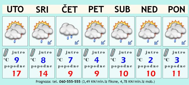 Utorak bi nam trebao donijeti kombinaciju oblaka i kraćih sunčanih razdoblja. Moguć je pokoji pljusak. U nekim dijelovima naše županije možda utorak prođe i sasvim suho. Temperatura zraka ostaje ugodna pa bi u popodnevnim satima mogla narasti na toplih 17 ili 18 Celzijevih stupnjeva. Puhat će lagani sjeveroistočni vjetar.