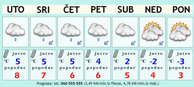Utorak bi trebao biti uglavnom suh uz puno oblaka, vjerojatno sunca uopće neće ni biti. Kako se dan bliži kraju ponegdje može biti slabe kišice, osobito uz slovensku granicu. Puhat će uglavnom slab vjetar istočnih smjerova. Jutarnja temperatura od 3 do 6, a najviša dnevna bi mogla narasti na 7 ili 8 Celzijevih stupnjeva, dakle bit će malo hladnije nego prethodnih dana.