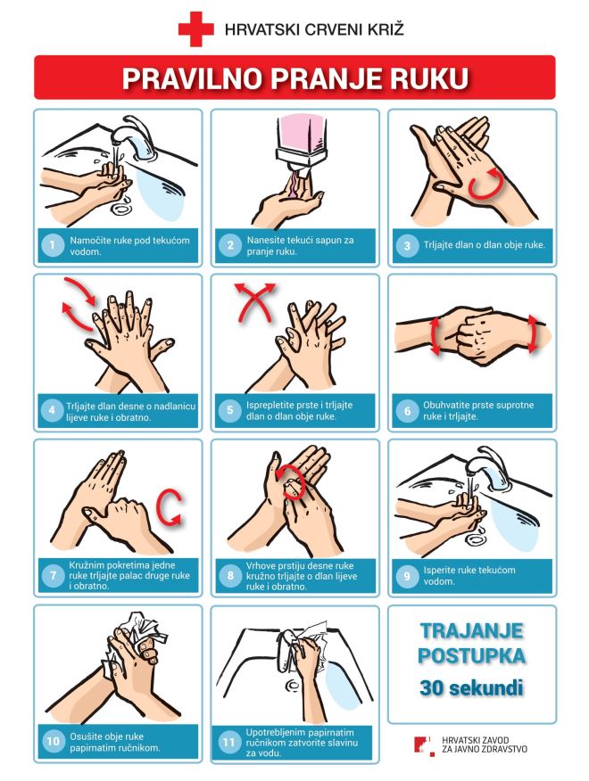 Stanje i dezinfekcija ruku ključni su za sprječavanje infekcije. Ruke treba prati često i temeljito sapunom i vodom najmanje 20 sekundi. Kada sapun i voda nisu dostupni možete koristiti dezinficijens koji sadrži najmanje 60% alkohola. Virus ulazi u tijelo kroz oči, nos i usta. Stoga ih nemojte dirati neopranim rukama.
