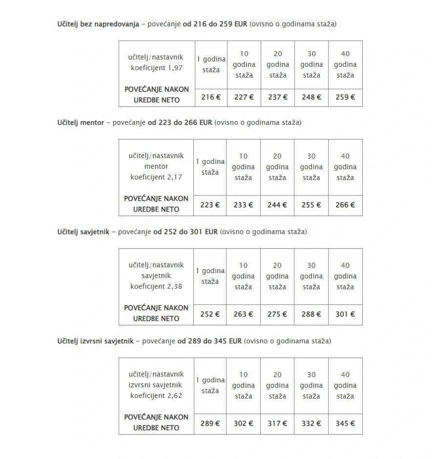 Tako će učitelji bez napredovanja dobiti od 216 do 259 eura, učitelji mentori od 233 do 266, učitelji savjetnici od 252 do 301-og eura, a učitelji izvrsni savjetnici od 289 do maksimalnih 345 eura.