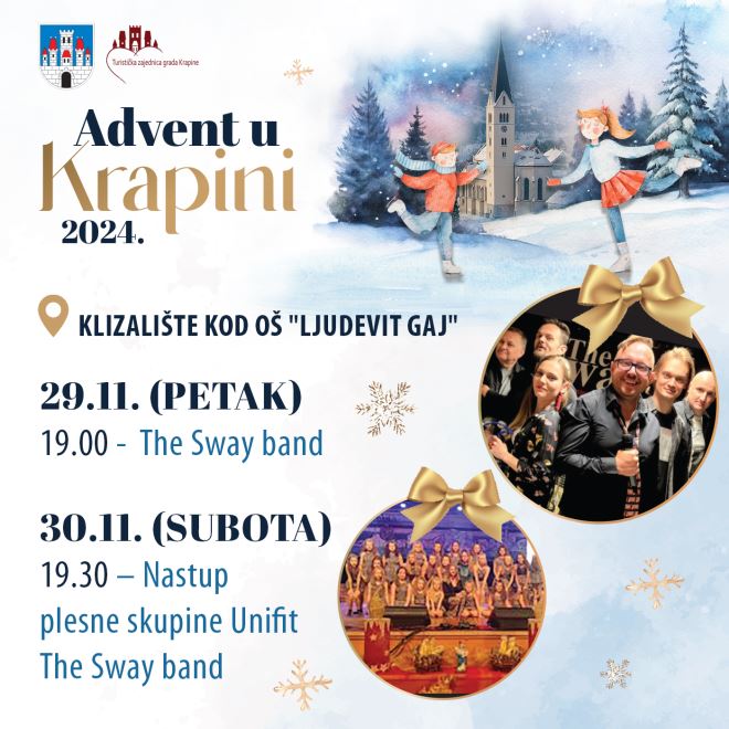 U petak, 29.11. počinje adventska čarolija u Krapini otvorenjem klizališta pod šatorom kod Osnovne škole "Ljudevit Gaj" u 19.00 sati uz cjelovečernju svirku The Sway Banda i ugostiteljsku ponudu hrane i pića , te prodaju božićnih ukrasa.