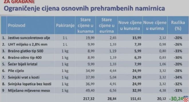 Tako će jestivo suncokretovo ulje primjerice biti jeftinije za 4 kune, neće više koštati 19,99 nego 15,99 kuna, a svinjska vratina 13 kuna manje. Umirovljenici će dobiti jednokratni dodatak, a postoji i još neke mjere za najugroženije socijalne skupine.