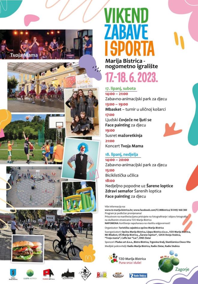 Velika manifestacija ''Ljeto u Mariji Bistrici'' donosi Vikend zabave i sporta, a događanja sele na nogometno igralište NK Mladost. I u subotu i u nedjelju od 14 sati osiguran je besplatan zabavno-animacijski park za djecu, druženje uz klauna i facepainting. Subota donosi i turnir u uličnoj košarci od 13 sati, Ljudski čovječe ne ljuti se od 17 sati, Susret mažoretkinja od 19 i Koncert banda ''Tvoja mama'' od 21 sat. U nedjelju od 15 sati na rasporedu je Biciklistička učilica, a od 18 sati Zdravi semafor „Šarenih loptica“. Više informacija pronađite na webu i fejsu Visit Marija Bistrica.