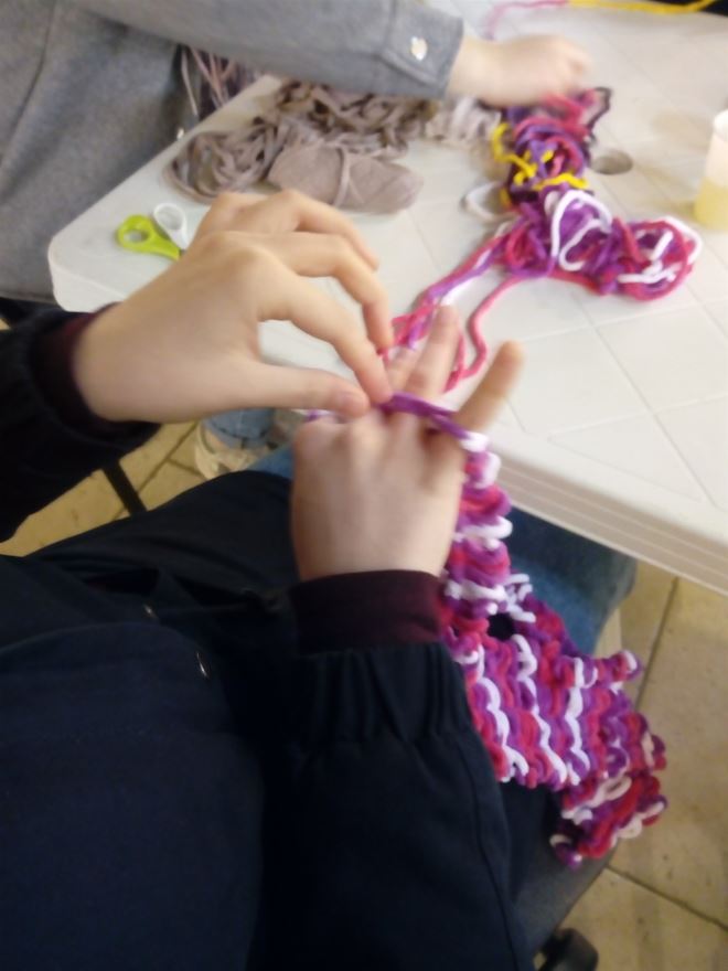 Djecu i voditelje poučavalo je desetak demonstratora i to vještini pletenja prstima i rukama bez igala. Djeca su ozbiljno i motivirano učila pletenje što je bilo i pravo vježbanje fine motorike prstiju. Neki su to proglasili najzanimljivijom igrom. Ispletene tople trake za kosu i šalovi sve su oduševili i dali im ideju kako će plesti zanimljive božićne poklone svojim najdražima.