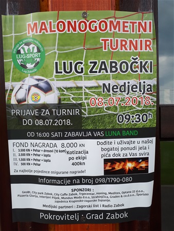 Tradicionalni malonogometni turnir u Lugu Zabočkom na igralištu kod prostorija Udruge Lug sport održat će se u nedjelju 8. srpnja s početkom u 9:30 sati. Kao i svake godine, fond nagrada je bogat – iznosi čak 8.000 kuna. Ekipa koja će osvojiti prvo mjesto osvojit će 3.500 kuna, pehar i 10 dresova, ekipa koja će osvojiti drugo mjesto osvojit će 2.500 kuna, pehar i loptu, a ekipa koja zauzme treće mjesto 1.500 kuna, pehar i lopta, a četvrta ekipa osvojit će 500 kuna i pehar. Naravno, tu su i osigurane nagrade za najbolje pojedince. – Dođite i uživajte u našoj bogatoj ponudi jela i pića dok za Vas svira Luna bend – pozivaju organizratori.