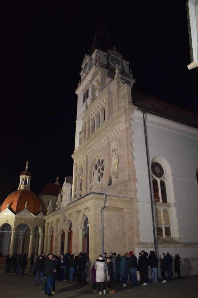 Jučer, na Badnjak služeno je pet misa. Misom zornicom rano ujutro označen je kraj Došašća, a u večernjem dijelu služene su čak četiri polnoćke i kod sve četiri Bazilika je bila ispunjena, a mnoštvo vjernika misu je pratilo i izvan Bazilike. Najprije je u 19.30 služena polnoćka za najmanju djecu i za prvopričesnike, a predslavio ju je preč. Drago Bosnar.