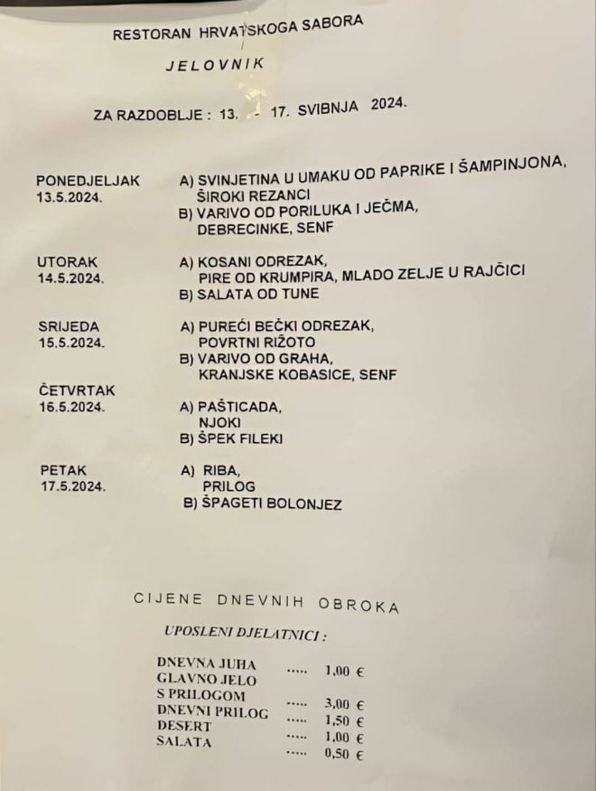Društvenim mrežama danas tako kruži ovotjedni meni. Svakog dana, uposleni djelatnici Hrvatskog sabora mogu birati između dva menija. U ponedjeljak se kuhala svinjetina u umaku od paprike i šampinjona uz široke rezance