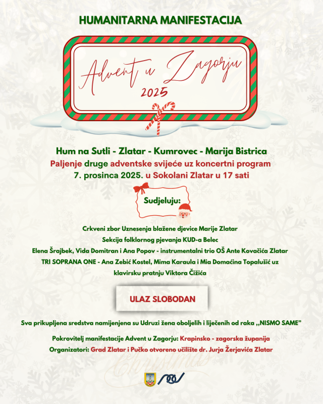 Ulaz je slobodan, a prikupljaju se humanitarni prilozi za žene oboljele i liječene od raka za Udrugu „Nismo same“. Prva svijeća na županijskom adventskom vijencu upaljena je prošle nedjelje u Humu na Sutli, nakon Zlatara slijedi Kumrovec, a četvrta svijeća pali se tradicionalno u Mariji Bistrici.