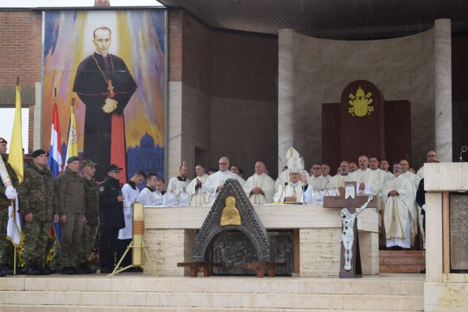 Euharistijsko slavlje, uz koncelebraciju brojnih svećenika, predslavi vojni ordinarij u RH mons. Jure Bogdan. Kiša pada, nije spriječila održavanje hodočašće, no ono je ipak malo prilagođeno vremenskim uvjetima, pa nije bilo mimohoda i križnog puta.