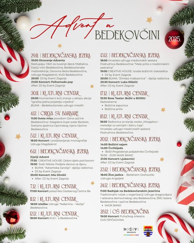 Adventska bajka na Bedekovčanskim jezerima započela je večeras. Bedekovčina se ove godine može pohvaliti bogatim i raznovrsnim adventskim programom, koji će se protezati kroz četiri subote, a ove subote održano je svečano otvorenje, na kojem su nastupili vrtićki mališani, Bedekovčanske mažoretkinje, OŠ Bedekovčina, Udruga Magdalenić i KUD Bedekovčina. Posjetitelji su se zabavljali uz DJ by Evenet Zagorje, a od 21 sat slijedi koncert Psihomodo popa.