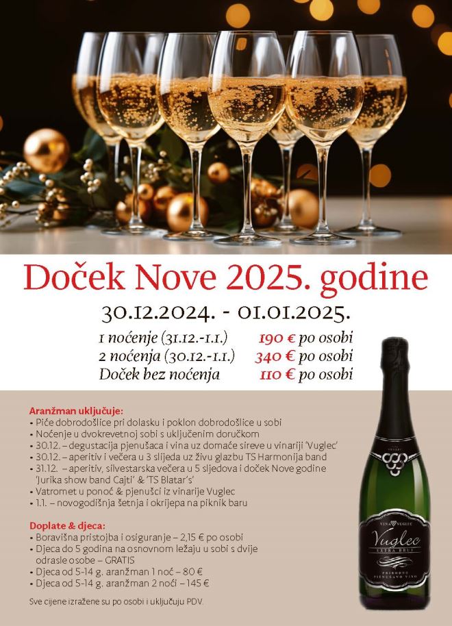 Provedite doček u autentičnom abijentu Vuglec Brega uz domaću hranu i vrhunsko vino.