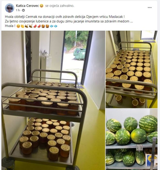 Objavivši fotografije doniranog meda i lubenica, ravnateljica je napisala: 'Hvala obitelji Čermak na donaciji ovih zdravih delicija Dječjem vrtiću Maslačak! Za ljetno osvježenje lubenice, a za dugu zimu jačanje imuniteta sa zdravim medom … Hvala!"