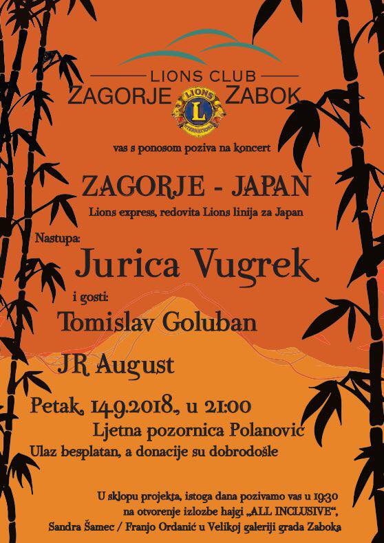 Lions Klub Zagorje sutra, u petak 14. rujna, organizira glazbeno-umjetničku poslasticu, odnosno predstavljanje projekta Zagorje-Japan, Lions Express. Tako će se u Gradskoj galeriji Zabok s početkom u 19:30 sati održati izložba hajgi 'All inclusive' Sandre Šamec i Franje Ordanića.
