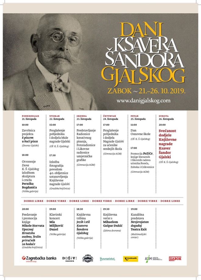 Na konfrenciji je predsjednik Upravnog odbora kulturne manifestacije Tihomir Vrančić ukratko opisao program manifestacije 'Dani Gjalskog' koja će se odvijati od ponedjeljka 21. listopada do subote 26. listopada. - Ove godine obilježavamo 40. godišnjicu ustanovljenja Nagrade. Pripremili smo bogat program. Započinjemo s izložbom akademskog slikara Peruška Bogdanića koja se održava u ponedjeljak 21. listopada u Gradskoj galeriji. Drugi dan, u utorak 22. listopada se u 17:30 u Gradskoj knjižnici održava izložba fotografija povodom 40. obljetnice ustanovljenja Nagrade. Kako nam je bitan razvoj stvaralašt među djecom osnovnih i srednjih škola pa se tako se tako u utorak 22. listopada u 15 sati održava proglašenje pobjednika i dodjela Male nagrade Gjalski u OŠ K. Š. Gjalskog, a proglašenje pobjednika i dodjela Nagrade Gjalski za učenike srednjih škola održat će se u četvrtak 24. listopada s početkom u 17 sati u Gimnaziji Antuna Gustava Matoša. U petak 25. listopada održava se promocija PoZiCe, knjige literarnih i likovnih radova učenika Poreča, Zaboka i Crikvenice. Svečana dodjela Nagrade bit će u subotu 26. listopada s početkom u 20 sati u Osnovnoj školi K.Š. Gjalskog gdje ćemo u ime Ministarstva kulture, Krapinsko-zagorske županije i Grada Zaboka javnosti predstaviti nagrađenog pisca i nagrađeno djelo - rekao je Vrančić.