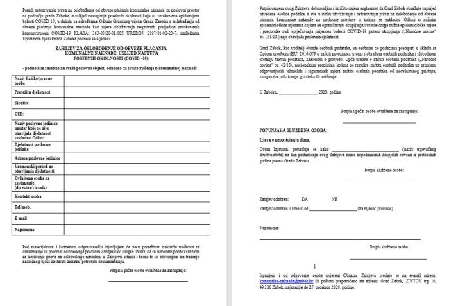U svrhu pomoći gospodarstvu Grada Zaboka u prevladavanju poteškoća uzrokovanih epidemijom bolesti COVID -19 pozivaju se svi vlasnici/korisnici poslovnih prostora na području Grada Zaboka u kojima se obavljaju djelatnosti koje su obuhvaćene mjerom obustave rada propisane Odlukom o nužnim epidemiološkim mjerama kojima se ograničavaju okupljanja i uvode druge nužne epidemiološke mjere da najkasnije do 27. prosinca 2020. godine upravnom tijelu nadležnom za poslove komunalnog gospodarstva podnesu pisani Zahtjev za oslobođenje od obveze plaćanja komunalne naknade uslijed nastupa posebnih okolnosti (COVID – 19).