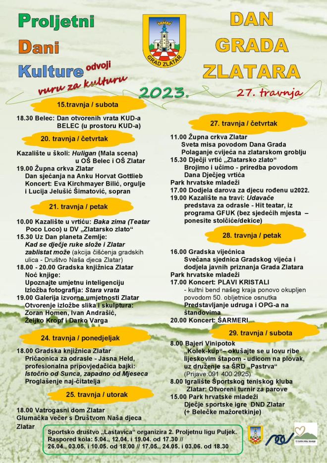Grad Zlatar 27. travnja slavi svoj Dan. Program kojim će ove godine obilježiti Dan Grada objedinjen je s kulturnom manifestacijom ‘Proljetni Dani Kulture’ čijim programom Pučko otvoreno učilište dr. Jurja Žerjavića Zlatar, u suradnji s gradskim ustanovama u kulturi i udrugama, Gradom Zlatarom i Turističkom zajednicom, poziva građane da „odvoje vuru za kulturu“. Uz kulturna događanja po svom izboru, pridružite se u proslavi Dana Grada 27. travnja i tijekom vikenda, 28. i 29. travnja, uz zabavni program u gradskom parku i sportska događanja zlatarskih udruga.
