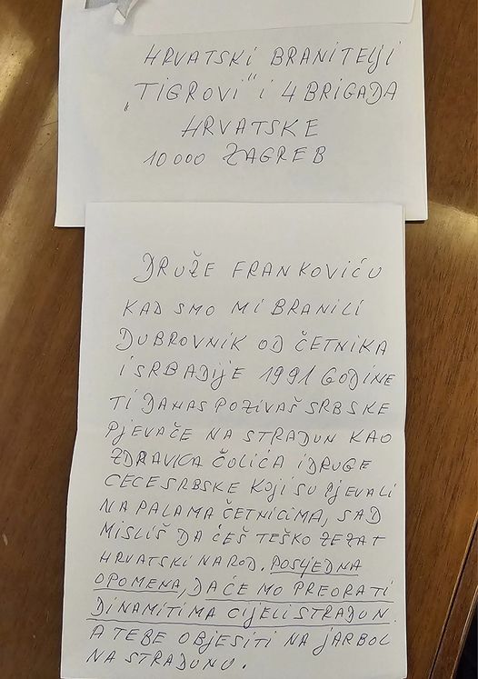 "Druže Frankoviću, kad smo mi branili Dubrovnik od četnika i srbadije 1991. godine ti danas pozivaš srbske pjevače na Stradun kao Zdravka Čolića i druge Cece srbske koji su pjevali na Palama četnicima, sad misliš da ćeš teško zezat hrvatski narod", stoji u prijetnji.