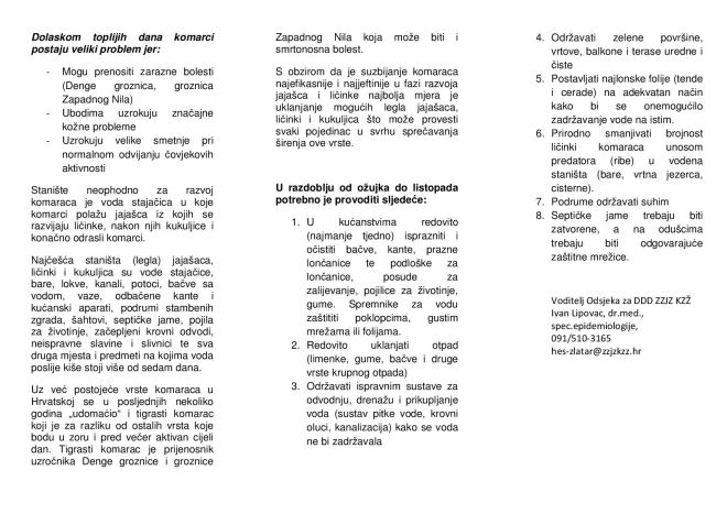 - Za njihov razvoj potrebna je stajaća voda te ako im želimo smanjiti brojnost potrebno je tu vodu redovito izlijevati ili onemogućiti pristup komarcima takvoj vodi. Čovjek, najčešće nesvjesno, stvara niz takvih umjetnih legla u svojoj okolini koja onda postaju mjesta za razmnožavanje komaraca –rekao je dr. Lipovac i dodao da sustavnih akcija suzbijanja komaraca na području KZŽ do sada nije bilo, iako je u programu mjera zasuzbijanje prijenosnika bolesti to predviđeno.