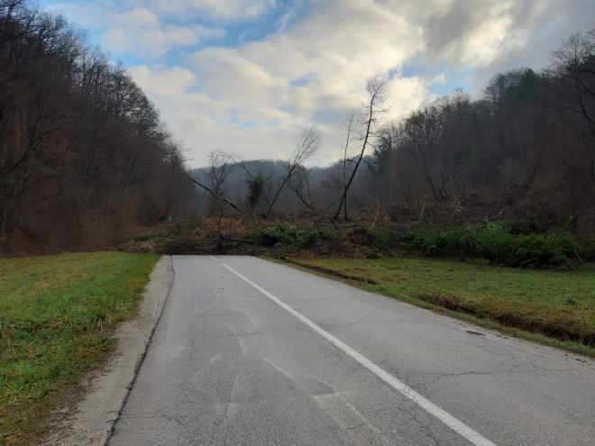 Aktiviranjem klizišta, velika količina zemljanog i kamenog materijala sa brda kliznula je preko ceste.