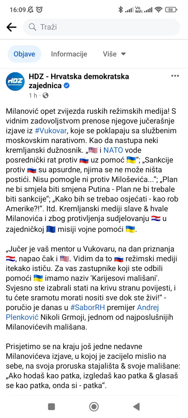 Hrvatska demokratska zajednica (HDZ) reagirala je danas na izjave predsjednika Zorana Milanovića iz Vukovara da "Sjedinjene Države i NATO sudjeluju u posredničkom ratu protiv Rusije na teritoriju Ukrajine", a koje su prenijeli ruski mediji.