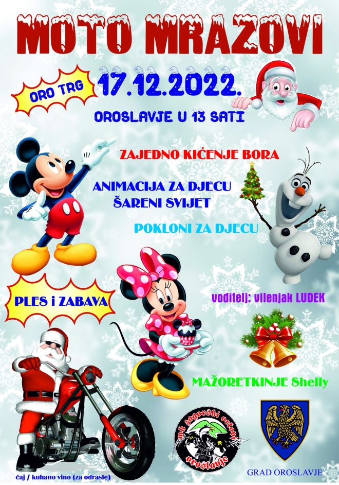 - Draga djeco, pridružite nam se u  druženju sa Moto mrazovima , vilama, Bakom Mraz, pomoćnicima Djeda Mraza i konačno sa Djedom Mrazom. Ponesite svoj ukras za bor, kojim ćemo zajedno okititi Božićno drvce. Uz to, odlično se zabavite, zaplešite i zapjevajte zajedno sa Mickey Mouseom, Minnie i Olafom, Mažoretkinjama Shelly, djecom i tetama iz Dječjeg vrtića Cvrkutić. Šlapica i Čarobna šuma, sve pod voditeljskom palicom Zorana Vukića- poznatijeg kao vilenjak Ludek. Veliko iznenađenje i radost sprema Vam  Animacija za djecu "Šareni svijet". Očekuju vas pokloni, jer i ove godine Moto Mrazovi imaju iznenađenje za svako dijete (i dobro i ono malo zločesto) koje se u subotu 17.12., nađe na Oro Trgu u 13:00 sati! Uz pjesmu i ples, moći ćete se slikati sa Djedom Mrazom  koji će svoje putovanje oko svijeta započeti baš u Oroslavju, i to baš te subote! Moto klub Zagorski Orlovi poziva i sve ljude dobre volje da se pridruže zajedničkom druženju, kićenju bora, dobroj zabavi, pjesmi i plesu uz čašicu čaja za male ili kuhanog vina za one malo veće, a za okrjepu vrijedne ruke baka- sudionica manifestacije Babičini kolači ispeći će za vas prefine kolače. Važno je napomenuti da sve nabrojeno i ponuđeno besplatno  za dječicu, zahvaljujući dobrim ljudima koji su prepoznali našu volju i želju da u ove predblagdanske dane razveselimo svakog – pozivaju iz Moto kluba Zagorski orlovi.