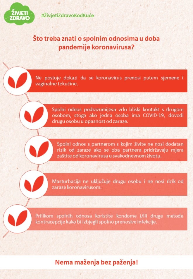 Hrvatski zavod za javno zdravstvo (HZJZ) objavio je preporuke kojih se treba pridržavati pri spolnim odnosima u vrijeme epidemije koronavirusa