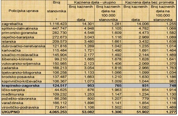 Tijekom prošle 2020. godine evidentirana su 953 kaznena djela što je za 22 ili 2,3 % manje nego u 2019. godini. - Ukupna razriješenost kaznenih djela u našoj PU iznosi 82,3 %, što je najveća razriješenost kaznenih djela unatrag 10 godina, dok državni prosjek razriješenosti kaznenih djela u 2020. godini iznosi 71,2 %. Prema statističkim podacima po počinjenim kaznenim djelima najsigurnija smo županija u Republici Hrvatskoj. Naime, na području naše policijske uprave, odnosno Krapinsko-zagorske županije, na sto tisuća stanovnika zabilježeno je 765 kaznenih djela. Kako smo sigurna županija možemo zaključiti i ako se usporedimo sa drugima i kažemo kako po broju kaznenih djela na sto tisuća stanovnika slijedi PU koprivničko-križevačka sa 1.009 kaznena djela ili kako je prosjek u Republici Hrvatskoj 1.306 kaznenih djela na sto tisuća stanovnika – naglašava Košutić. Najviše kaznenih djela zabilježili su PP Zabok - 303 ili 31,8 %, te PP Donja Stubica - 203 ili 21,3 %, zatim PP Zlatar Bistrica - 193 kaznenih djela, Krapina – 117, PP Pregrada – 75, a najmanje kaznenih djelaevidentirano je na području PP Klanjec - 57. Postaja prometne policije Krapina tijekom 2020. evidentirala je 5 kaznenih djela. Broj najčešćih kaznenih djela u ovoj godini u padu, a to se, prije svega, odnosi na kaznena djela krađe kojih je manje za 22,3% u odnosu na prošlu godinu i kaznenih djela teških krađa čije smanjenje u odnosu na lani iznosi 29,9%.