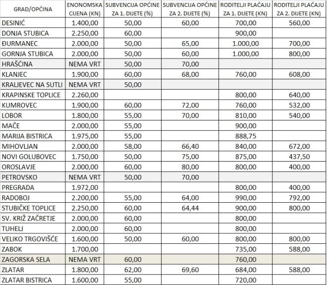Obzirom na izračunate troškove, ekonomske cijene u novim su vrtićima uglavnom 2.000 kuna, kolika je i ekonomska cijena gradskog i privatnog vrtića u Oroslavju, nakon što je Gradsko vijeće donijelo odluku o dizanju cijene. Ekonomske cijene vrtića dizale su se i u Donjoj Stubici i Stubičkim Toplicama, gdje je ona sada 2.250 kuna, u Mariji Bistrici (1.975 kuna) te u Radoboju (2.200 kuna), gdje na području općine radi jedan vrtić koji je u privatnom vlasništvu. Osim spomenutih, najviša ekonomska cijena vrtića je u Krapinskim Toplicama (2260 kuna), pregradski, kumrovečki i klanječki drže ekonomsku cijenu od 1.900 kuna, odnosno nešto malo više, dok su najniže ekonomske cijene vrtića u Desiniću (1.400 kuna), Zlatar Bistrici i Velikom Trgovišću (1.600 kuna). Subvencije općine, odnosno grada, za prvo dijete u vrtiću uglavnom su 50% i 60% posto, shodno tome, za prvo dijete u vrtiću najmanje plaćaju roditelji u Zlataru 684 kune, Desiniću 700 kuna, Zlatar Bistrici 720 kuna, Zaboku 735 kuna te u Kumrovcu, Klanjcu i Zagorskim Selima (koja nemaju vrtića, već subvencioniraju smještaj u okolnim vrtićima) po 760 kuna. Po 800 kuna za prvo dijete plaćaju roditelji u Velikom Trgovišću, Tuhlju, Svetom Križu Začretju, Pregradi, Oroslavju i Krapinskim Toplicama, 810 kuna u Loboru, 840 u Mihovljanu, 875 u Novom Golubovcu te 888,75 u Mariji Bistrici. Za prvo dijete najviše plaćaju roditelji u Đurmancu i Gornjoj Stubici po 1.000 kuna te Radoboju 990 kuna, zatim Donjoj Stubici, Maču i Stubičkim Toplicama po 900 kuna.
